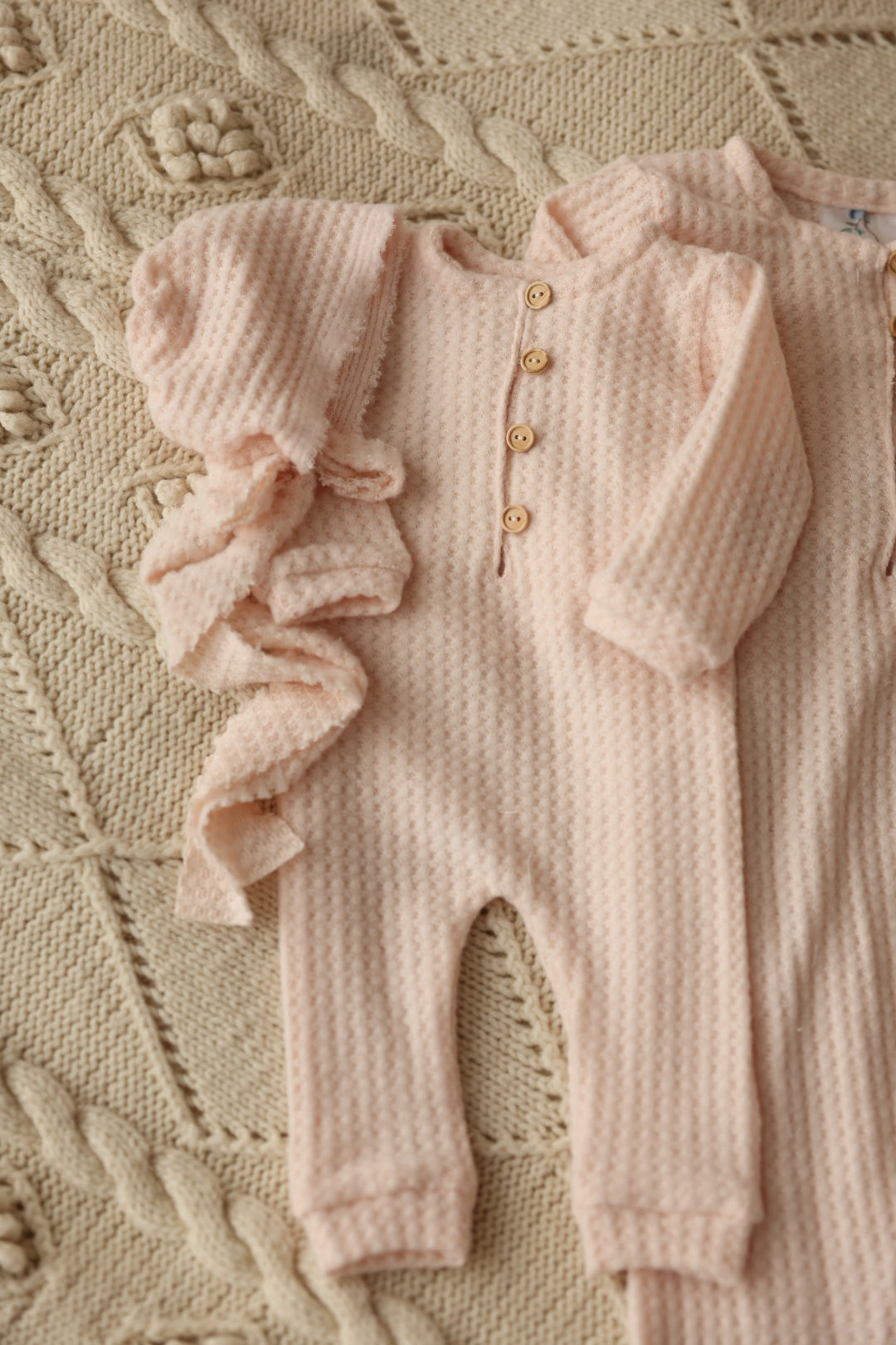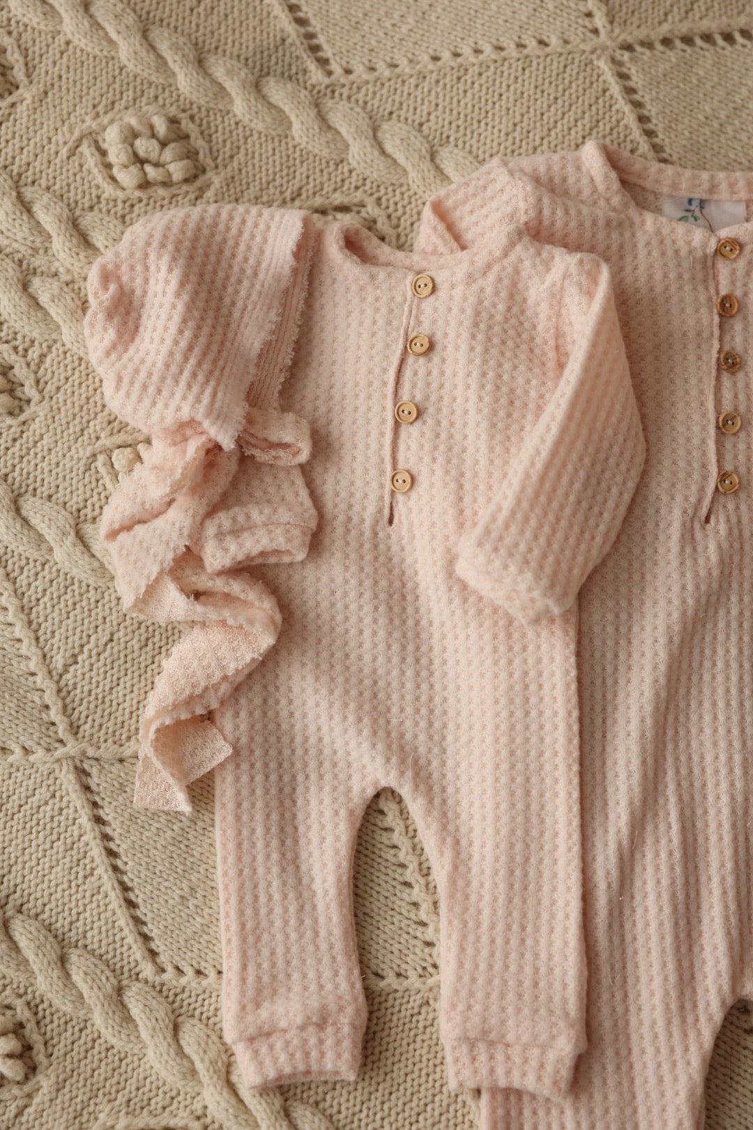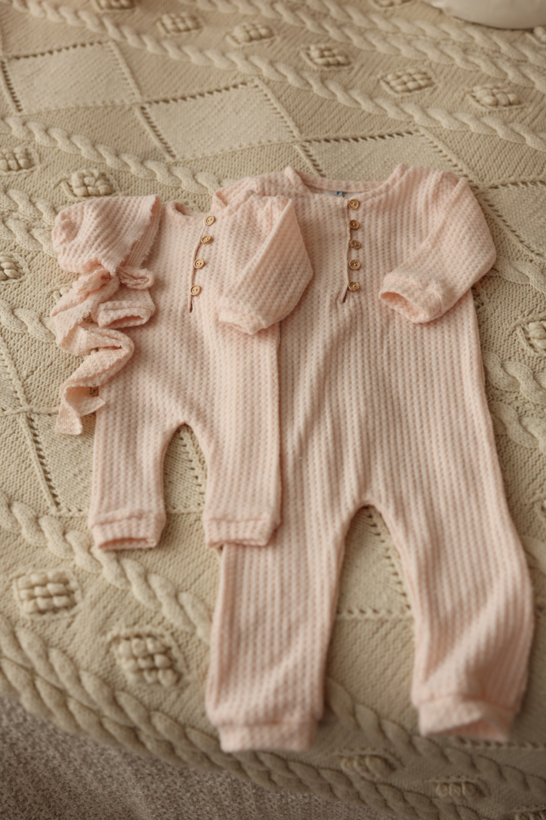barely blush waffle knit fabric, long leg, long sleeve, functional buttons