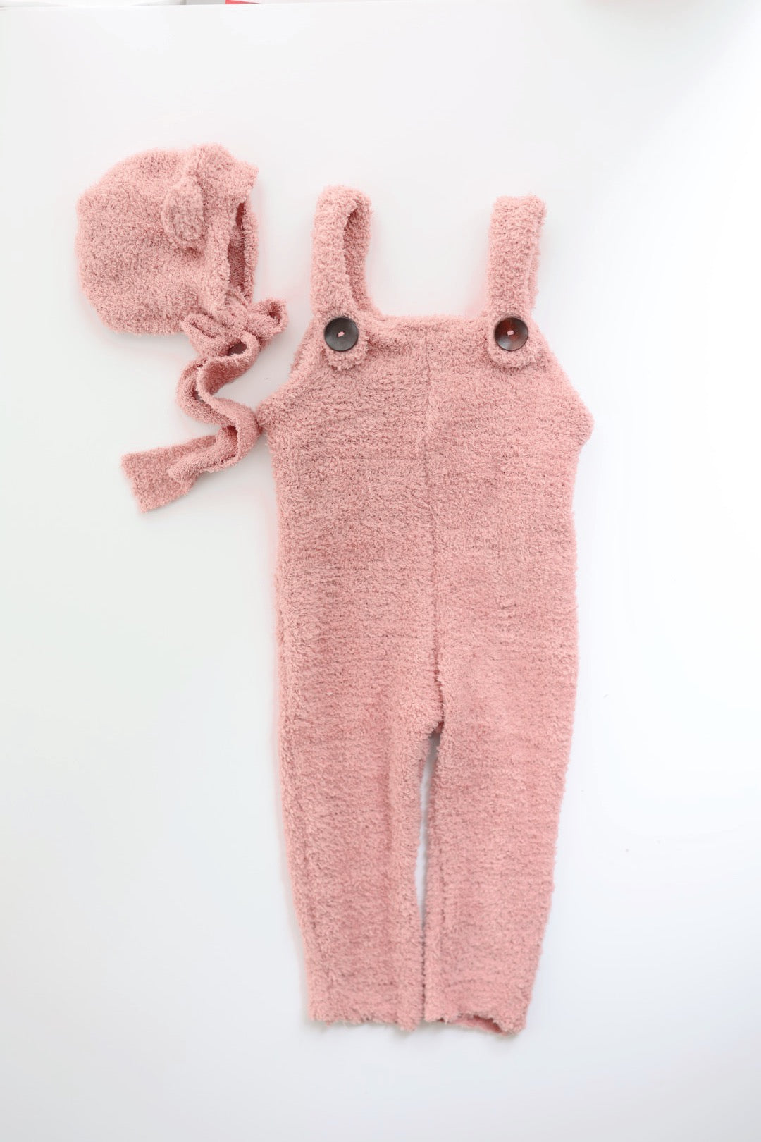 Pink Fuzzy Romper Collection - Pink Sitter bear bonnet is backordered and will ship as soon as it is back in stock.