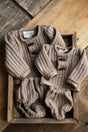 Thick textured double knit fabric. Taupe and functional buttons. Elastic waist and leg holes.